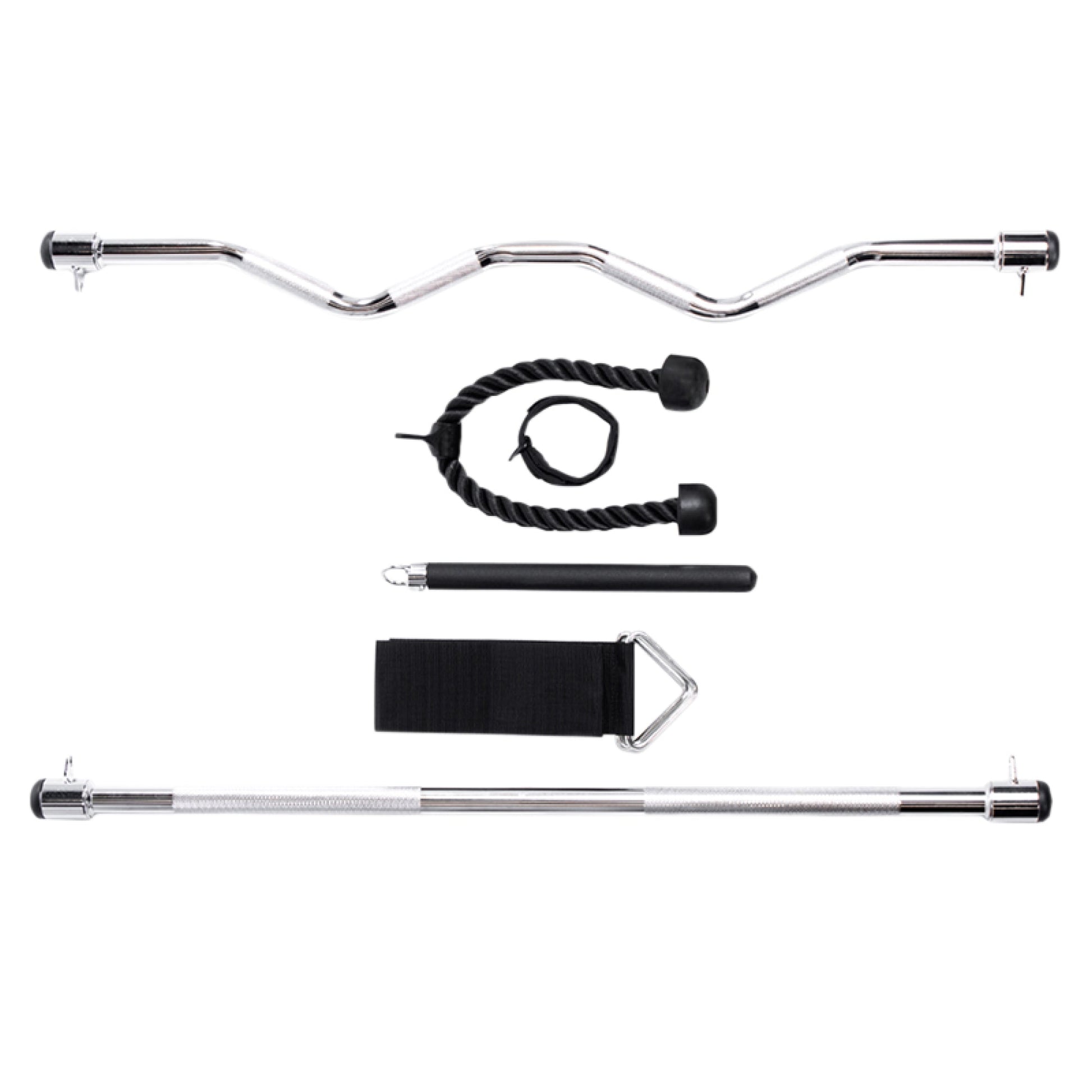 > Accessories made with high-quality, commercial-grade components. The thick, braided nylon for the triceps rope and the steel tubing for the bars are durable and built to last.